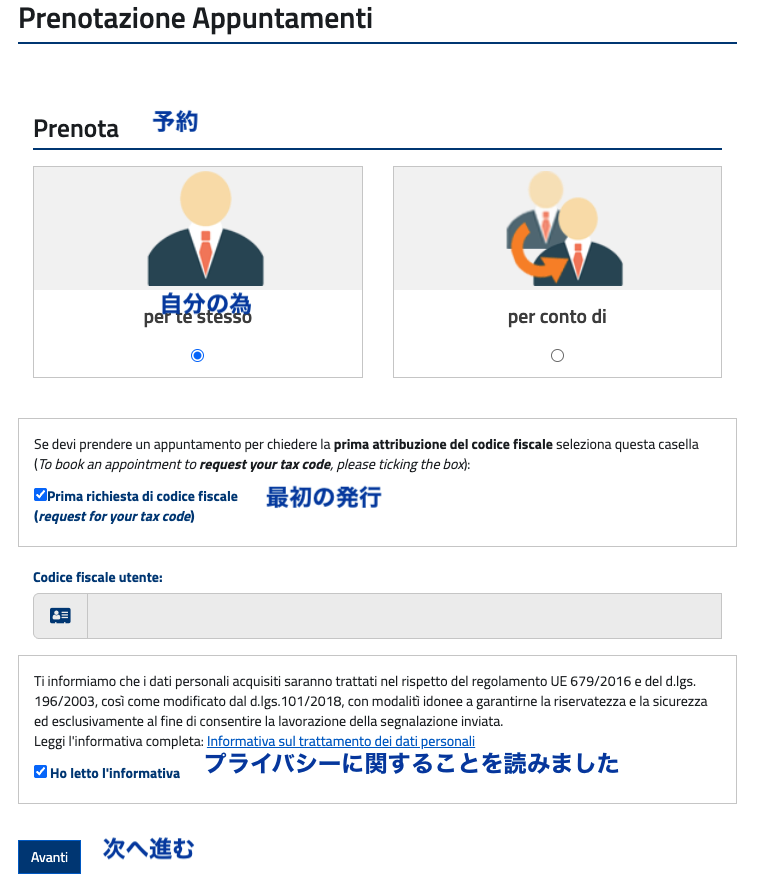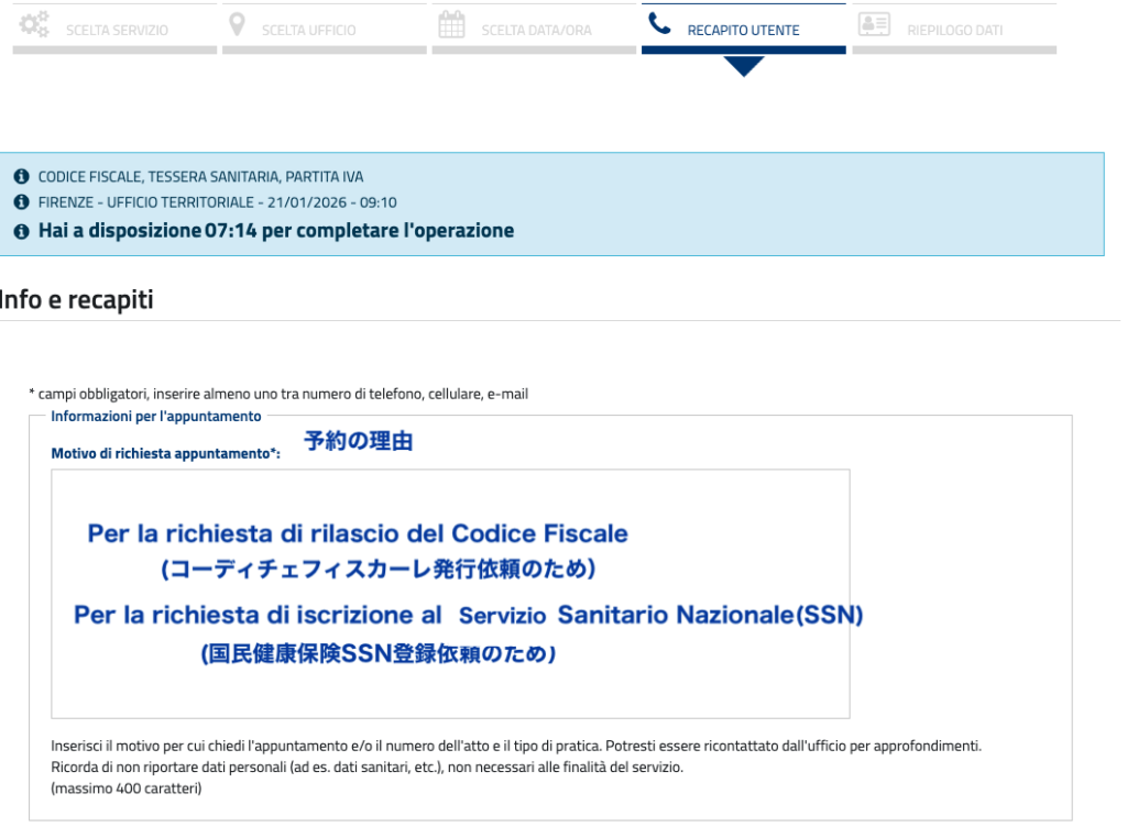 Servizio Sanitario Nazionale(国民健康保険証)SSN: (Tessera Sanitaria と呼ばれている)の申し込みもこちらから予約がとれます。